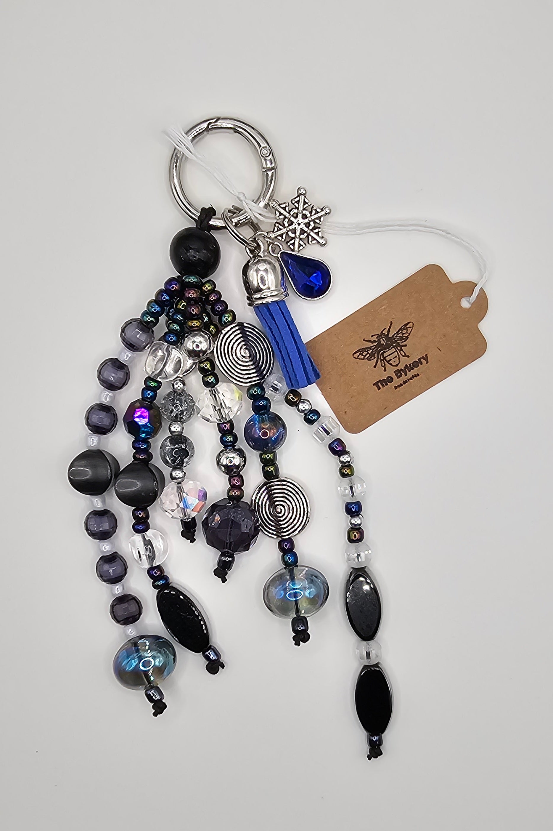 Silver spring key ring with various blue, purple, black and grey beads and charms. Handmade.